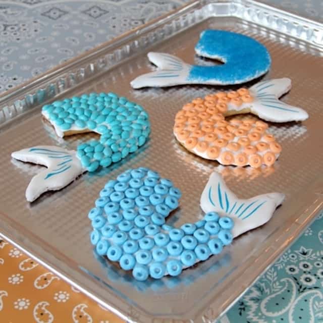 - Working with one cookie at a time, spread cooking icing on the tail fin. Then spread more icing on a 2-inch section of the tail, just above the fin and gently press candies into it, arranging them close together to resemble scales. Continue frosting and decorating the rest of the tail a section at a time until you reach the top. Or, you can simply sprinkle colored sugar on the icing in place of the candy.