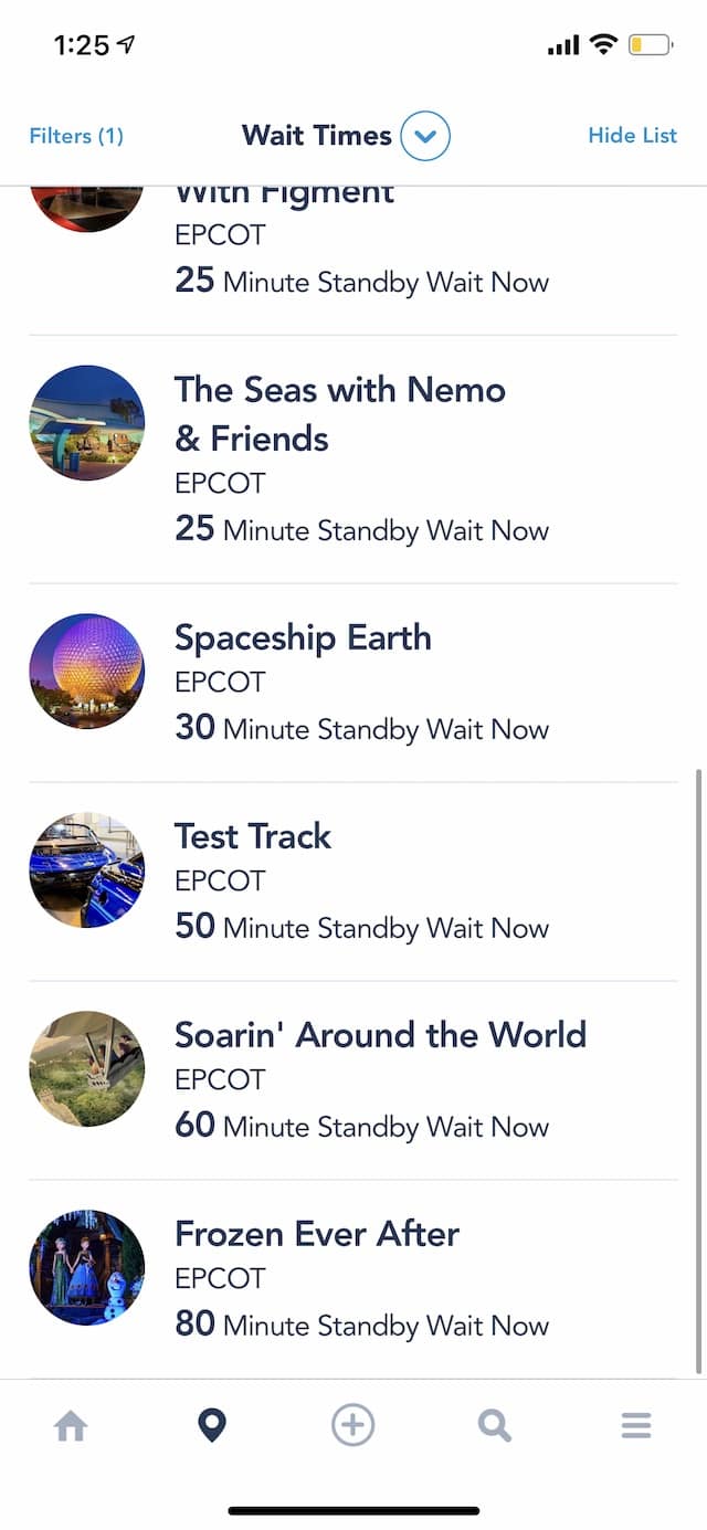 Spaceship Earth has a posted wait time of 30 minutes and Test Track has a 50 minute standby wait. Guests are currently waiting 60 minutes to ride Soarin' and 80 minutes for Frozen Ever After.