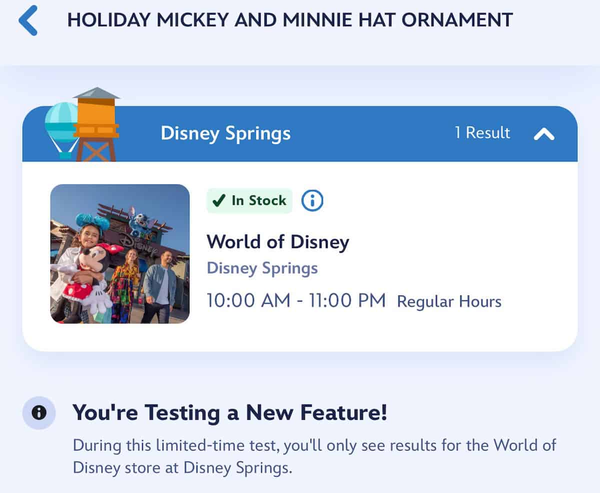 When I (Donna) selected the Holiday Mickey and Minnie hat ornament, it showed that it was in stock at the World of Disney.