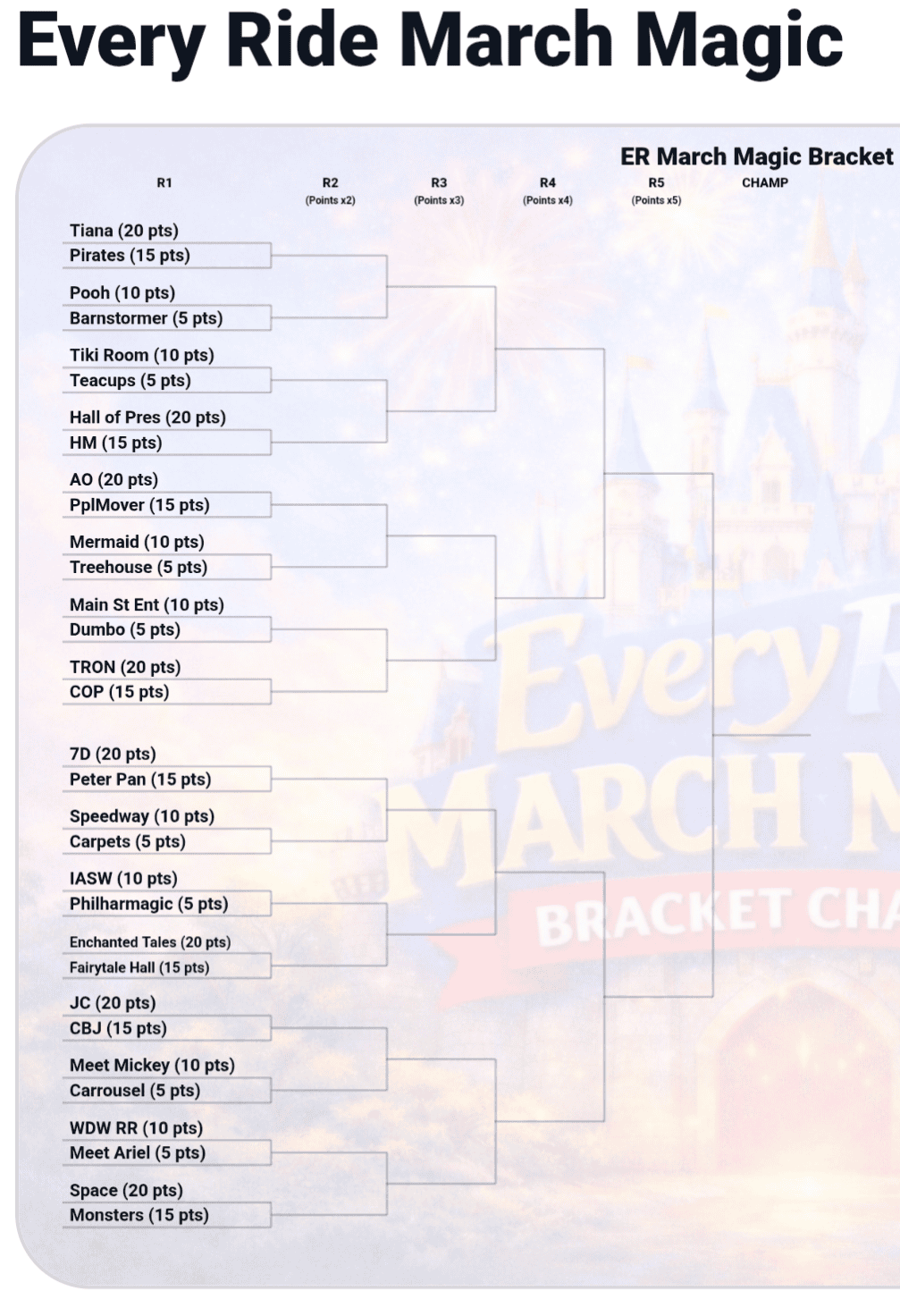 March Magic is a 32-attraction "March Madness" bracket-style event - complete attractions to advance them to the next round. Which ride will win your bracket?