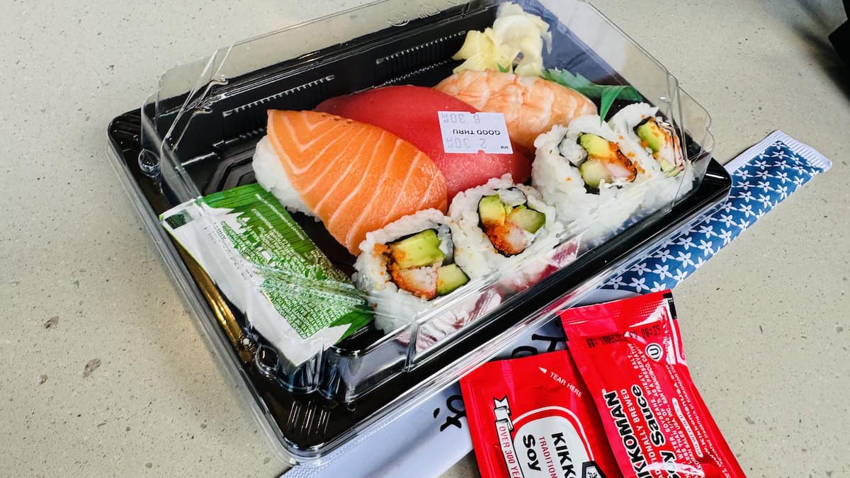And, it is good quality, too. I would say it is similar to really good grocery store sushi. It comes with 4 pieces of California roll and 3 pieces of Nigiri (tuna, salmon, and shrimp).